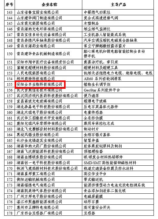 其中,河南有5家公司入選,分別是安陽全豐生物科技有限公司、富耐克超硬材料股份有限公司、人民電纜集團有限公司、鄭州奧特科技有限公司和安陽市翔宇醫(yī)療設(shè)備有限責任公司。